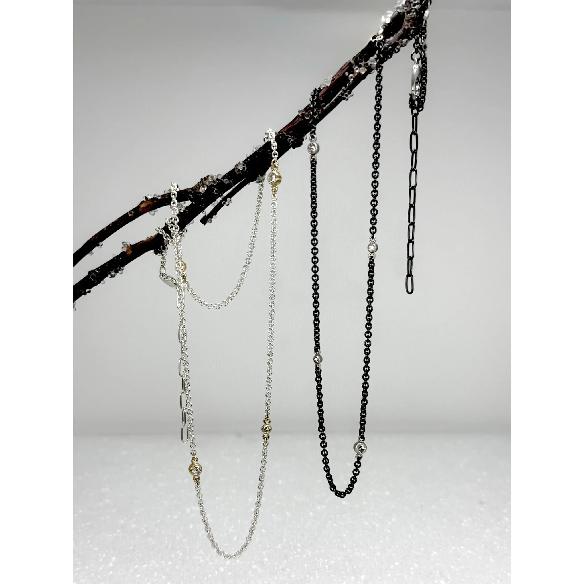 Oxidized sterling silver chain with brushed sterling silver bezel settings. Alternating sizes of seven lab grown diamonds, approximately 0.43 cttw. Total length is adjustable from 16”-18”.